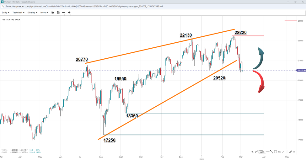 The Nasdaq might have formed a terminal wedge pattern at the peak of 22220, suggesting a potential continuation towards the lower trough of the pattern around 17250. The 19950 support remains a strong barrier, with a break below potentially triggering further selling pressure to 18360 and lower. Even if the short-term support holds, the index still faces downside risk as it trades below 20770 and 22130. Meanwhile, bullish price action could open the door past 22220 and potentially pave the way for 22500 and the 23k handle.