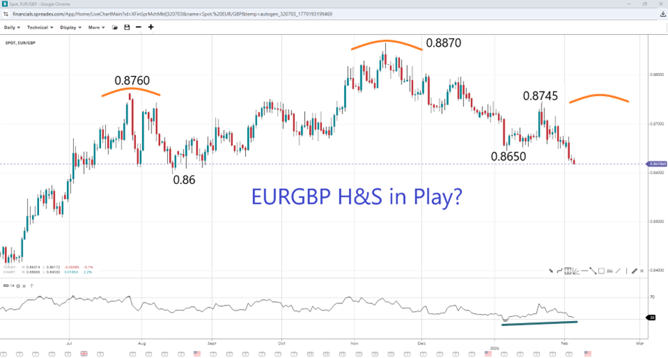 Markets see the BOE as slightly more dovish than the ECB, with one rate cut in Britain priced in this year, compared with none on the continent. However, recent inflation trends show consumer prices easing in the Eurozone, while in the UK, prices have been hotter than expected. This has allowed the pound to gain a little against the euro, causing the EURGBP to slide a bit in the latter part of January. Traders will be assessing the shifting odds of rate cuts following the BOE and ECB meetings on Thursday to better gauge the pair's direction. The recent weakness in the dollar has made the ECB concerned about the strength of the euro, adding disinflationary pressure, which isn't as much of a problem for the BOE, with inflation still above target.
