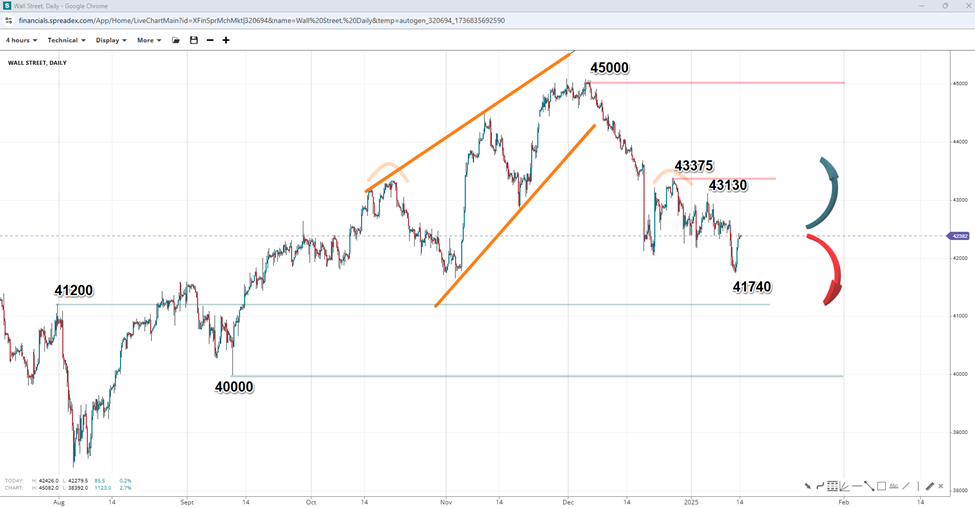 After an ending wedge pattern to 45000, the Dow Jones corrected over 7% to 41740, albeit a double bottom may have formed now. Further upside past the 43130 and 43375 peaks could act as an early signal of the uptrend resumption, while a break below could open the door to 41200 and eventually the 40000 handle, increasing the chances of a head-and-shoulders formation.