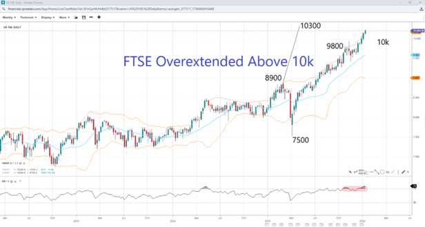 Following several weeks of upside, the UK’s premier index may be nearing a top near 10,300, which lies alongside the measured-move projection target of the 8,900–7,500 leg that formed in early 2025. The lower VWAP bank has also started to flatten out while the RSI remains in overbought territory, both suggesting a potential pullback. As the FTSE100 trades past the 10k handle, this is the line in the sand for short-term bullish price action, with the prior peak at 9,800 just below it. On the other hand, if the index claims the measured-move target, the odds of extending to the next psychological hurdle at 10,500 will improve.