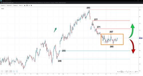 Tesco prices have traded sideways in June between 260 and 267, with an evident double-bottom formation opening up speculation for a short-term leg towards the upper range. Breaking outside the consolidation pattern might expose 271 to the top and 255 to the bottom unless momentum brings 277 and 248 in focus. In both cases, there appears to be a flag pattern, with the low likely in the former case and increased chances of reaching the top of 285, whereas a lower low would be expected in the latter case.