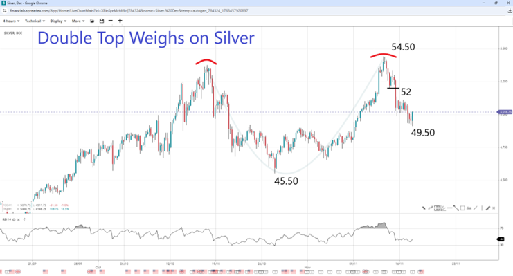 Market conviction of a rate cut in December is fading, putting pressure on precious metals. Traders will look for insight on the Fed's policy views in the FOMC minutes and partial jobs data this week.