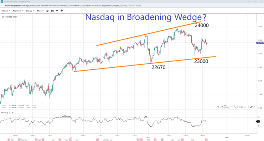 After surging higher on Friday in the wake of Powell's comments at Jackson Hole, the Nasdaq is pulling back. The index bounced off the 23K, with a break higher potentially breaking the August high at 24K, as the RSI remains below the 70 overbought region, and a broadening wedge may be under development. On the flip side, a continuation of the downturn could extend losses towards the recent swing of 23K, followed by the August low of 22670, which would imply a break of the lower trendline and further potential for losses.