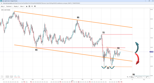 Crude oil prices have formed a double bottom at $55 for the time being, but the structure of lower highs from $65 to $64 suggests a descending triangle pattern could be unfolding if bulls fail to reclaim the regional top. In the event of prices falling below the $60 handle and the longer-term descending channel, WTI could be exposed to the crucial $50 level or even lower. On the flip side, if bulls manage to push through the critical resistance and enter the higher range between $65 and $80, crude could accelerate toward $70 and the $72 swing in the medium term, assuming the bulls flip $65 to support.