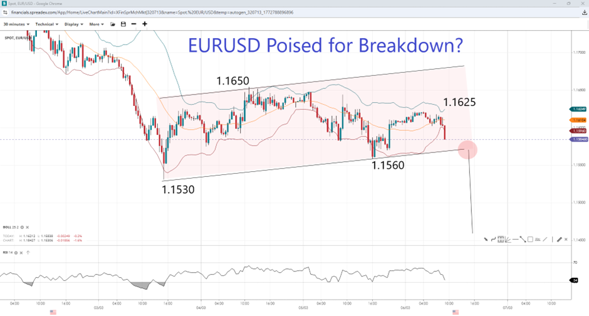 EURUSD has also been heading lower ahead of the NFP later today, losing the 1.1600 handle and paving the way for 1.1560 and the early February low at 1.1530. Breaking below the flag-like correction would expose the measured-move projection at 1.1450, while a bounce at the lower bound could see 1.1600 reclaimed by the bulls. A weak NFP might push EURUSD back to the 1.1650 peak if the upper band at 1.1625 gives way, though it is unlikely to change the longer-term macro trajectory so long as the Middle East conflict continues.