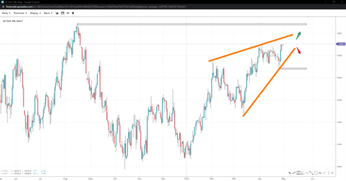 The US Tech index might have concluded a diagonal pattern above the 13225 mark, preparing for a decline towards 12690. The index is now pushing above its sideways range, with buyers needing to break past this local top to drive the rally to 13720 before reversing. A fall below 13k could indicate that the index may start to correct.
