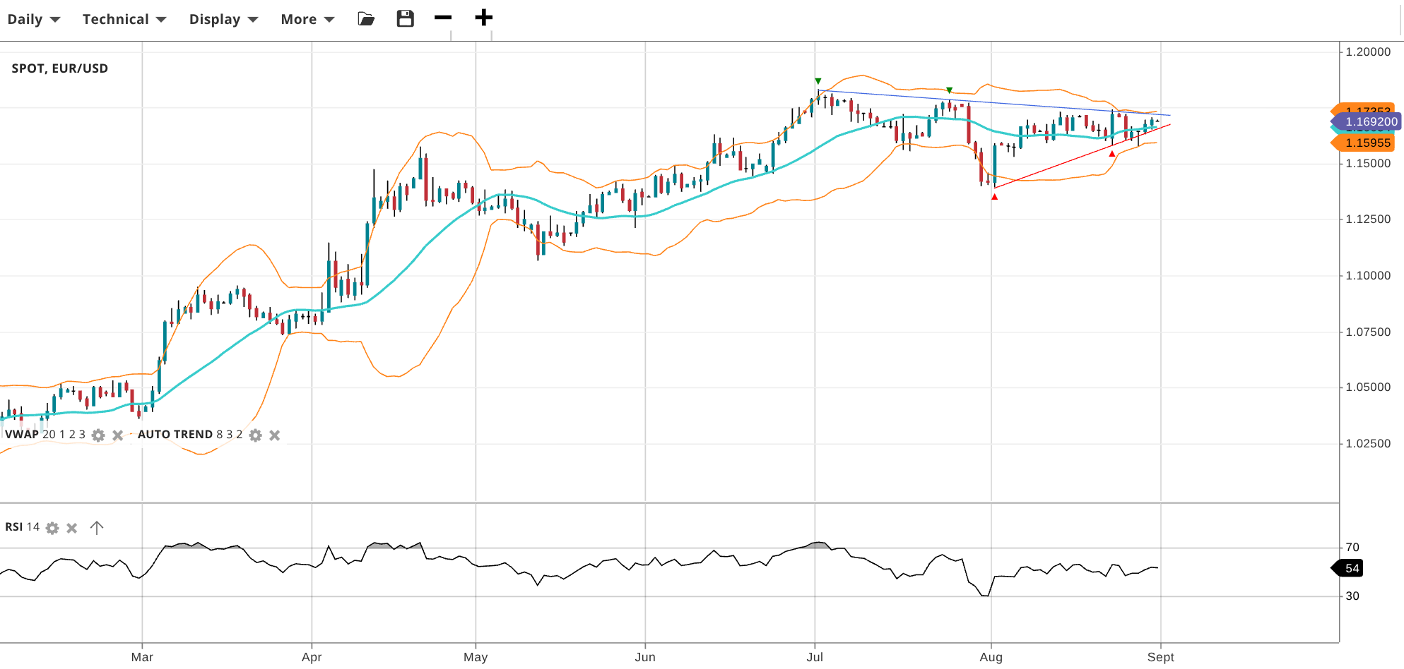 NOTE: These charts use the ‘Pro Trading Tools’ available on the SpreadEx trading platform. To use them, log in to your SpreadEx Financials Account and click ‘Technical’ from the menu on any chart.