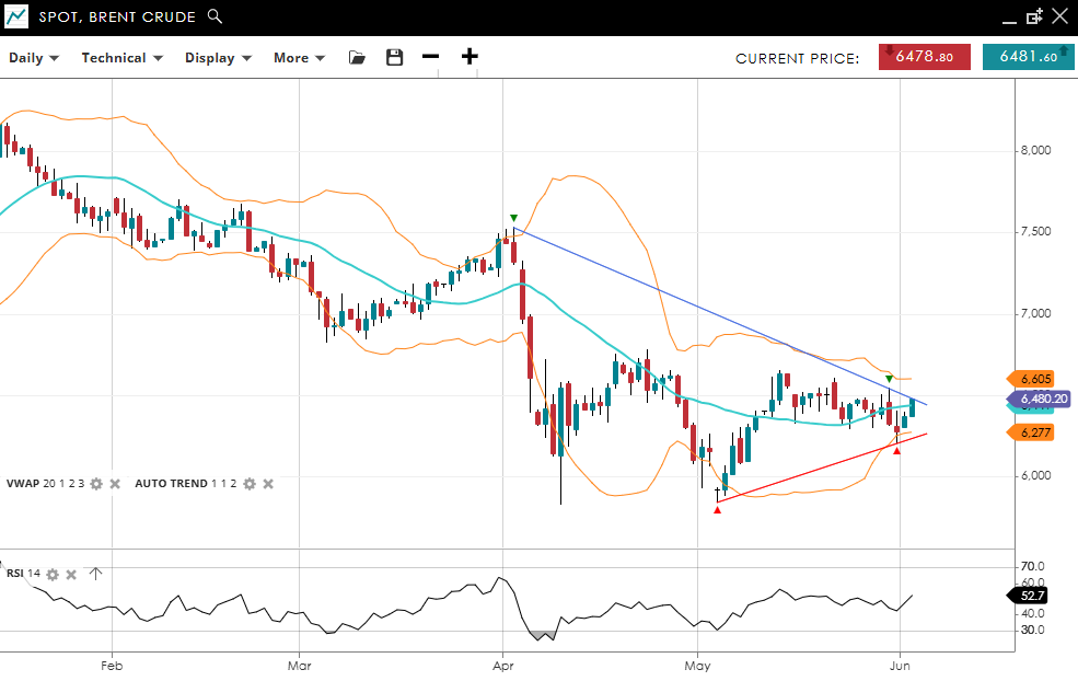 Brent Crude is in a neutral consolidation phase, trading at 6,480 narrowly above its VWAP but testing an upper autotrend line before a possible break higher. The RSI at 52.7 shows a balanced market outlook. Support is at 6,277, and resistance is at 6,605.