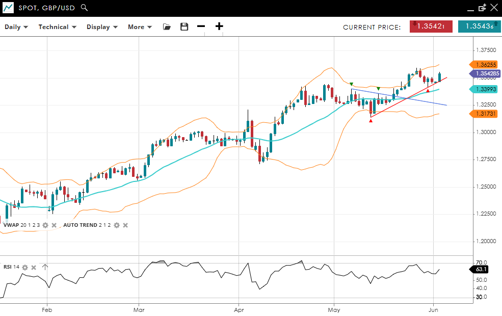 GBP/USD is in a bullish impulsive phase probing the 3-year high set last week, trading at 1.3543, comfortably above the VWAP of 1.3399. The RSI at 63.1 signals strengthening momentum. Support is at 1.31731, and resistance is at 1.36255.