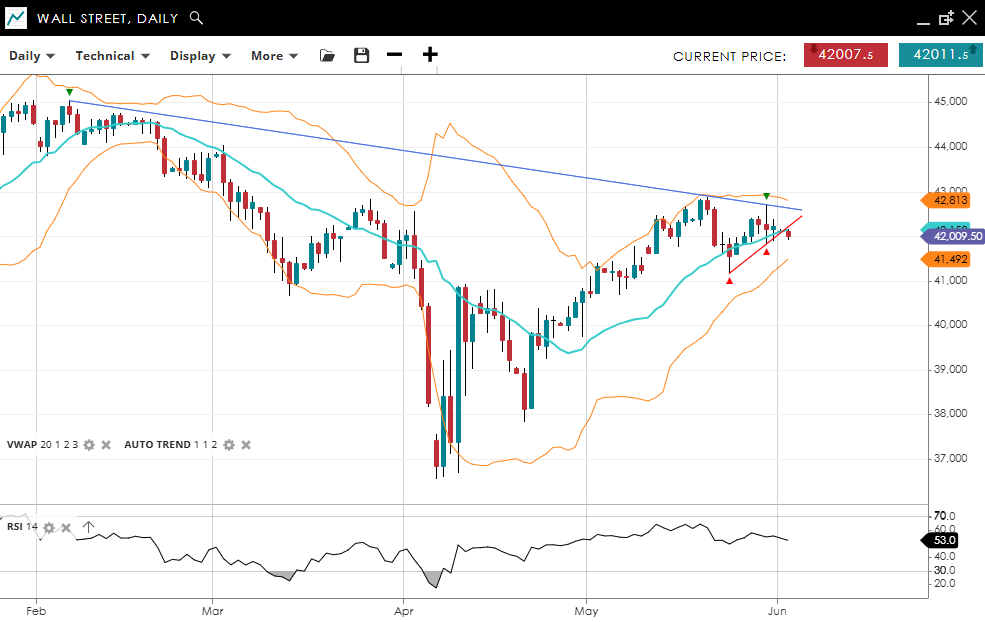 | Wall Street | Bullish | Correction | 42009 | 42150 | 41492 | 42813 | 53.0 |