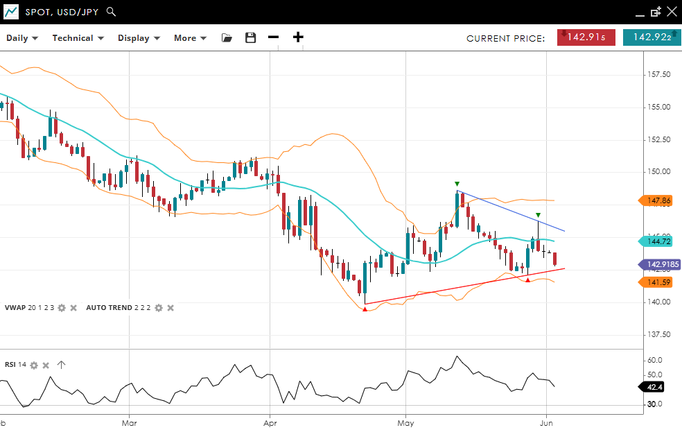 USD/JPY remains in a correction of its bearish trend, with price at 142.92 just above major support near 142.50 and below its VWAP at 144.72. The RSI at 42.4 suggests a neutral to bearish market. Support is at 141.59, with resistance at 147.86.
