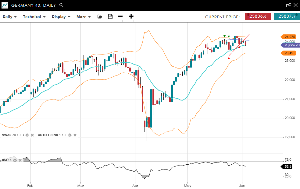 Germany 40 remains in a bullish trend and is currently in an impulsive phase that has slowed and could turn into a correction, trading at 23,837.4, right around its VWAP of 23,836.7. The RSI at 55.6 indicates more subdued buying interest. Support is at 23,421, with resistance at 24,275.