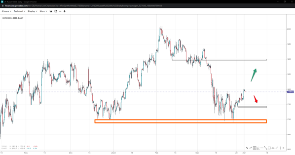 Russell 2000 formed a double bottom at 1700, with the recent rally potentially continuing towards the 1900 hurdle. 1835 is near-term resistance bulls must regain control for the rally to achieve higher levels. Sliding under 1740 might be an early signal of downward continuation instead.