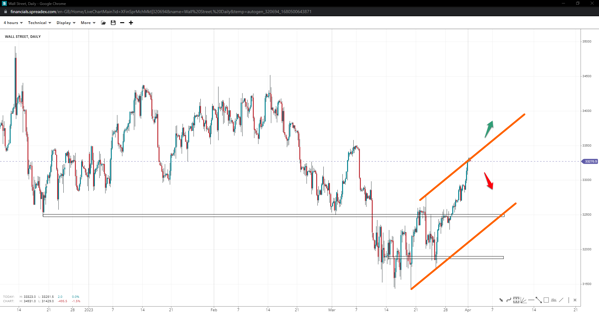 Wall Street has rebounded since receiving rejection at the lower end of the descending channel; bulls might be attempting to revisit the upper trendline under 34k. If the support at 32500 gives way to bears, the index might slide deeper to the upper 31k area.