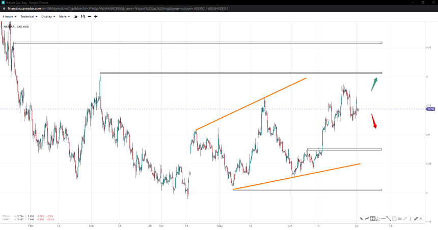 The price action of natural gas resembles a broadening wedge pattern, which may see the commodity extend to a high of 3.30/cf to complete it unless it has already been completed as prices traded above the second peak of 2.80/cf. Retracing towards 2/cf will increase the probability of a complete pattern, whereas a short-term correction towards 2.40/cf will not see much-increased chances.