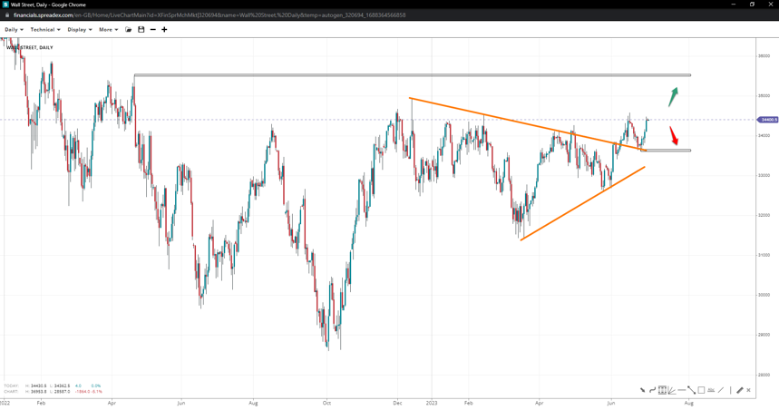 Wall Street confirmed the upper pennant trendline turned into support as it rose towards the peak of 34575 after a bounce at 33600, opening up 35k and the swing high of 35500. Failing to get through the regional top might see a correction towards 34k.