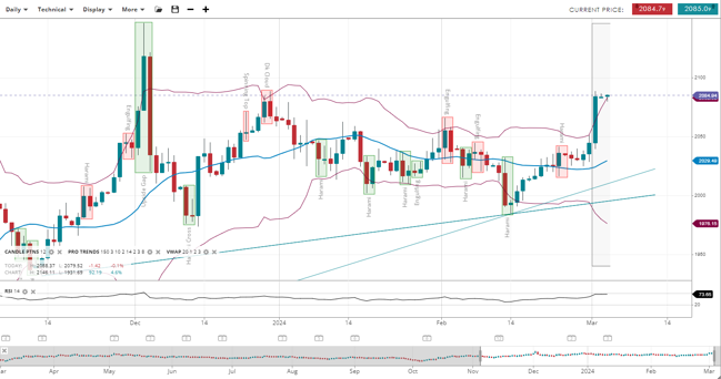Gold has entered a bullish trend in the impulsive phase, with its price at 2,084, well above the 20-period VWAP of 2,029. The support level has advanced to 1,976, with resistance now at 2,083. The RSI at 73 indicates a strong positive momentum, highlighting a significant change towards bullish sentiment.
