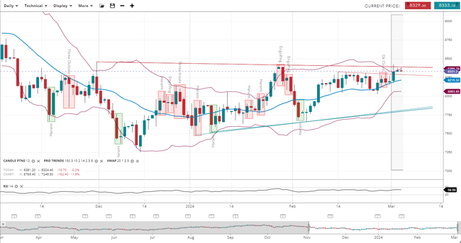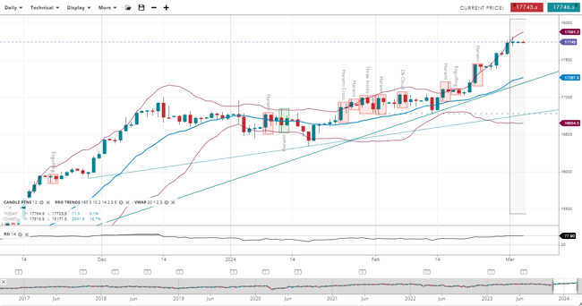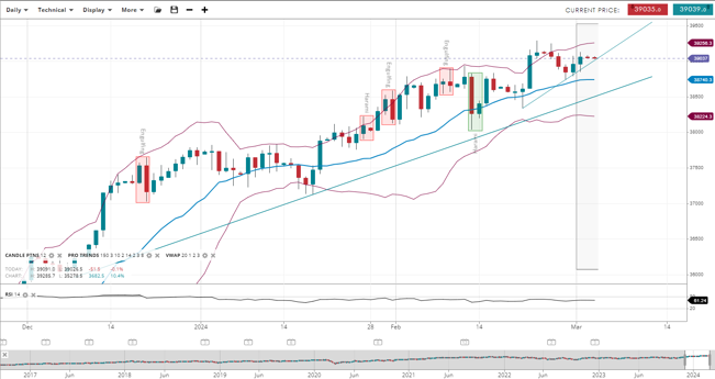 Wall Street is in the impulsive phase of a bullish trend, with its price increased to 39,037, above the upwards-sloping 20-period VWAP of 38,740. The support for this index has risen to 38,224, with resistance now at 39,256. The RSI has decreased to 61, indicating strong positive momentum, albeit slightly less than before.