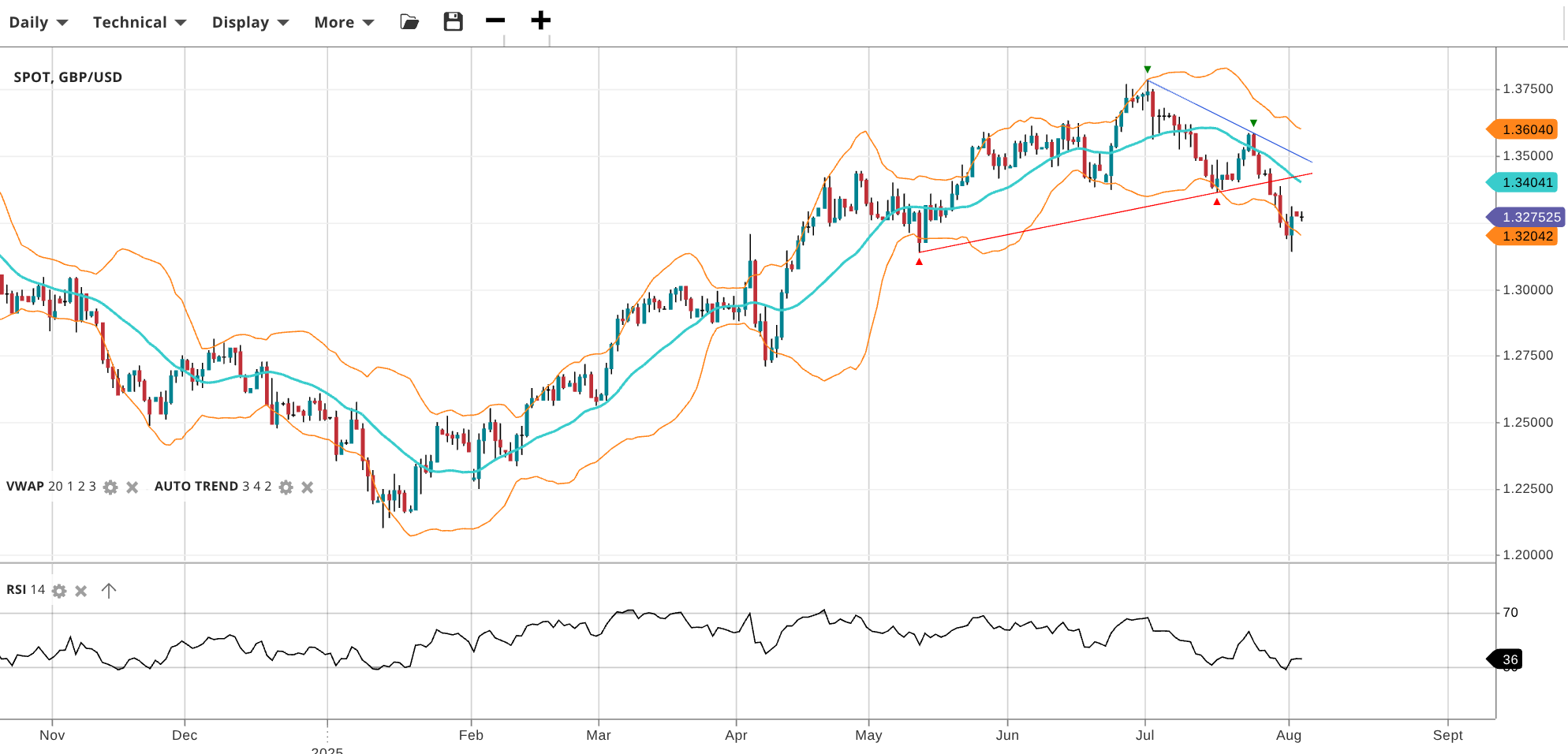 GBP/USD has potentially entered a new bearish trend in a quick reversal from the prior uptrend. It trades at 1.3275, below the VWAP of 1.3404. The RSI of 36 signals fresh bearish momentum. Support is at 1.3204 and resistance at 1.3604.
