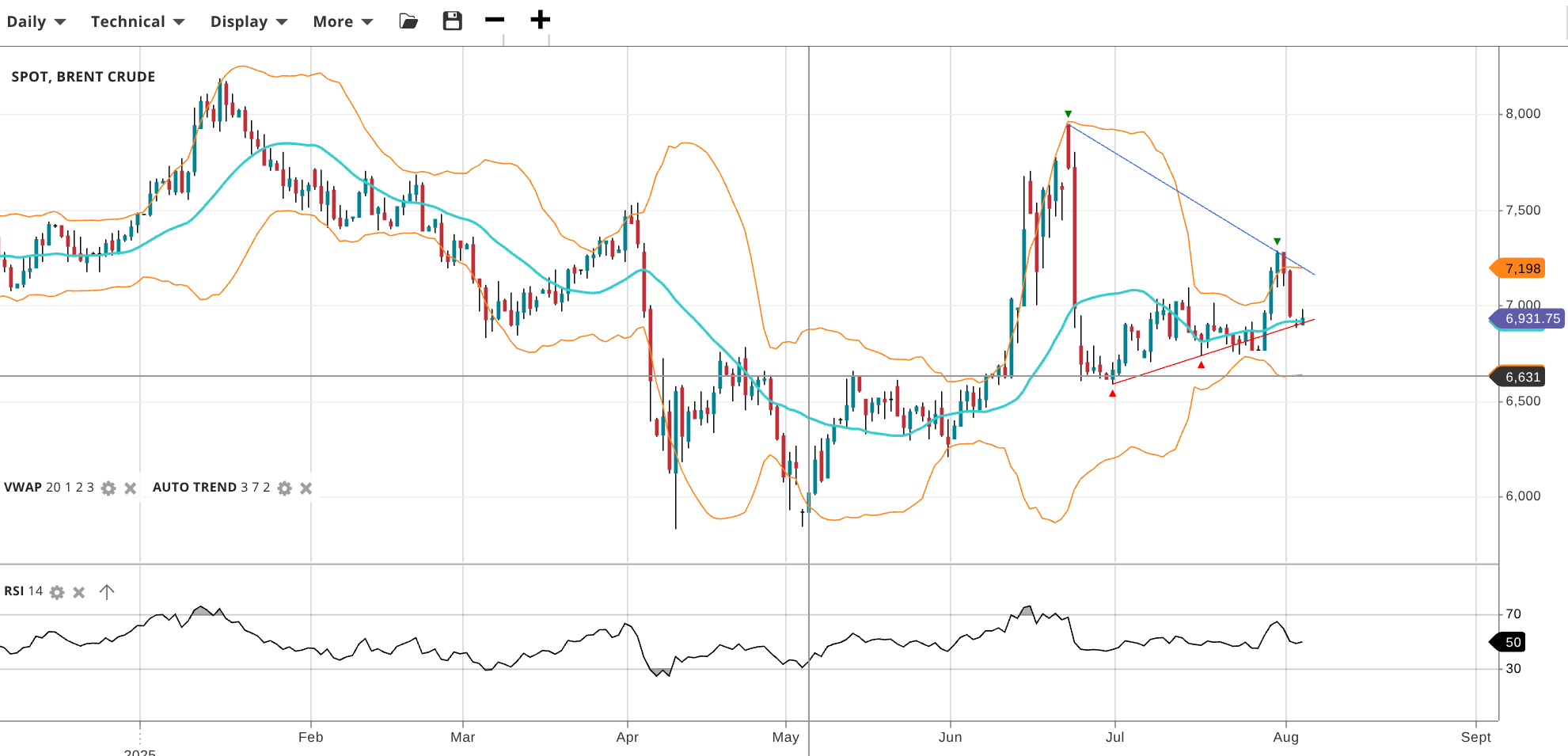 Brent Crude continues in a choppy range, albeit with lower volatility, trading at 6,932, right at its VWAP. The RSI at 50 confirms the lack of directional bias. Support sits at 6,631 and resistance at 7,198.