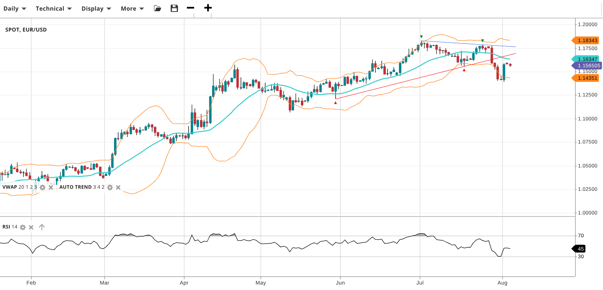 EUR/USD holds a bullish trend but is correcting. The pair trades at 1.1565, slightly below the VWAP of 1.1635. RSI at 45 reflects subdued buying pressure. Support is at 1.1435 and resistance at 1.1834.