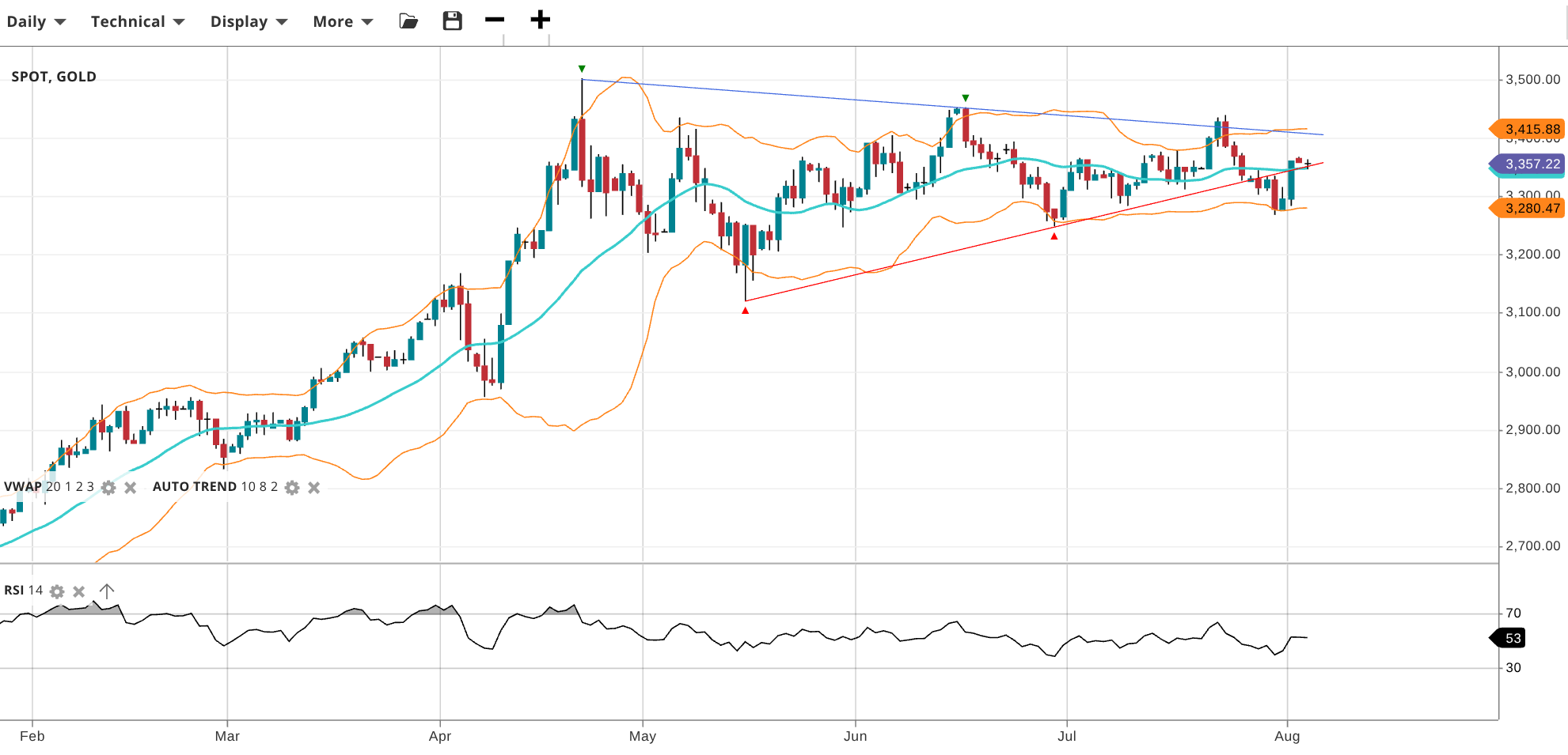 Gold continues to consolidate in a broad triangle pattern - keeping it in a neutral range, with price at 3,357, nearly equal to its VWAP. The RSI at 53 shows a balanced outlook. Support is at 3,280 and resistance at 3,416.