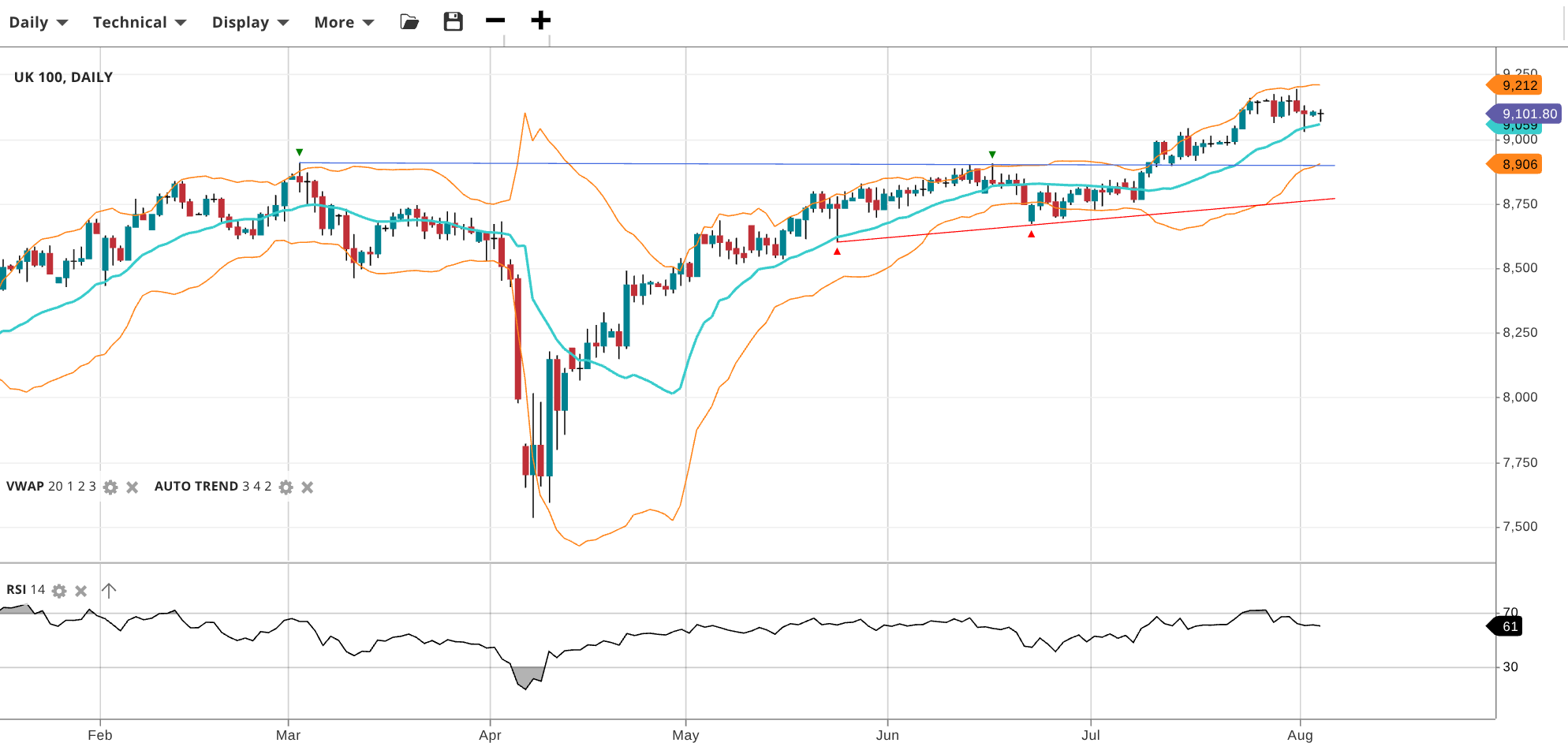 The UK 100 continues its bullish trend, undergoing a small pullback. Price is at 9,102, just above its VWAP at 9059. RSI at 61 indicates steady bullish interest. Support is at 8,906 and resistance is at 9,212.