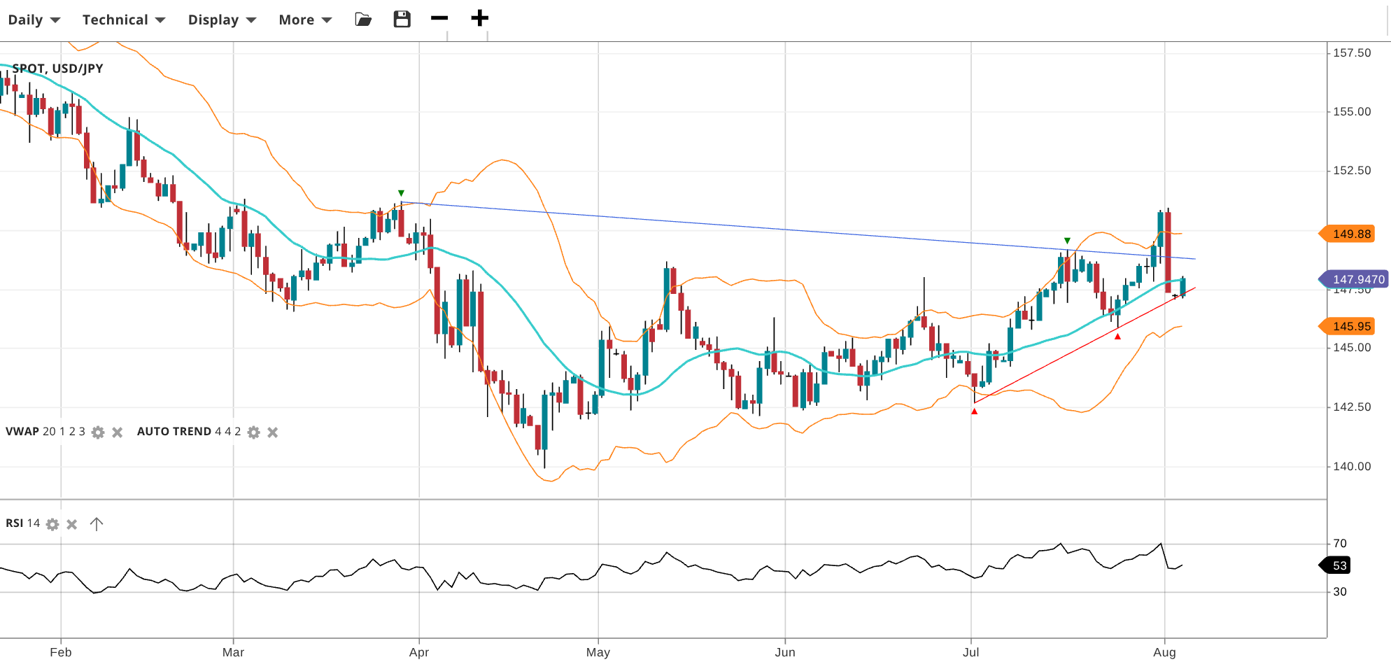 USD/JPY remains neutral and in a range phase but is possibly building a new uptrend with its recent drop back from range resistance. Price is 147.95, aligned with the VWAP. RSI at 53 suggests a balanced tone. Support is near 145.95 and resistance stands at 149.88.