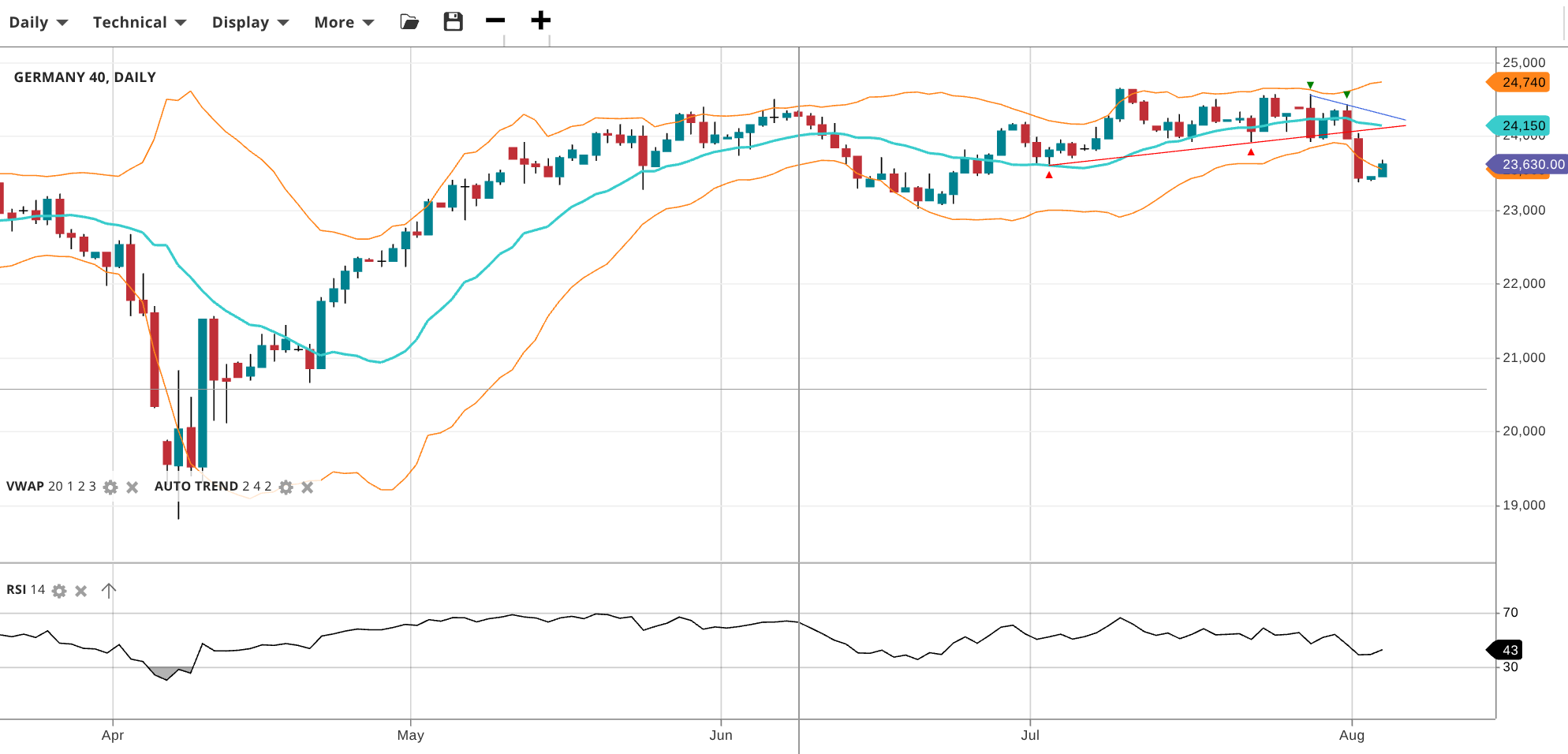 Germany 40 is now in a range-bound environment, currently trading at 23,630, below its VWAP of 24,150 and close to StdDev #2 Lower. RSI at 43 reflects weakening momentum. Support lies at 23,630 and resistance is seen at 24,740.