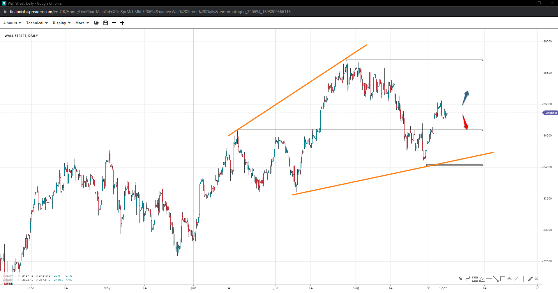 Dow Jones has a similar price action, but its medium-term path resembles an open wedge, pending further breakouts past 35700. Critical support lies at 34570, with a slide under there potentially leading to 34k.
