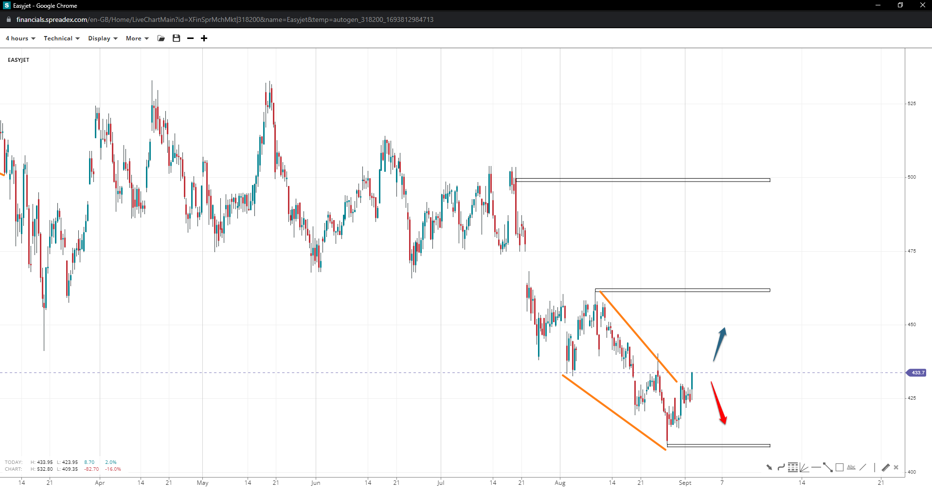 The price of EasyJet may have formed a wedge at 410 GBX, increasing speculation for a reversal with 460 GBX and the 500 GBX barrier closer to reality. If bullish momentum wanes ahead of or at 440 GBX, the pattern may be invalidated, potentially inspiring bets to 400 GBX or lower.