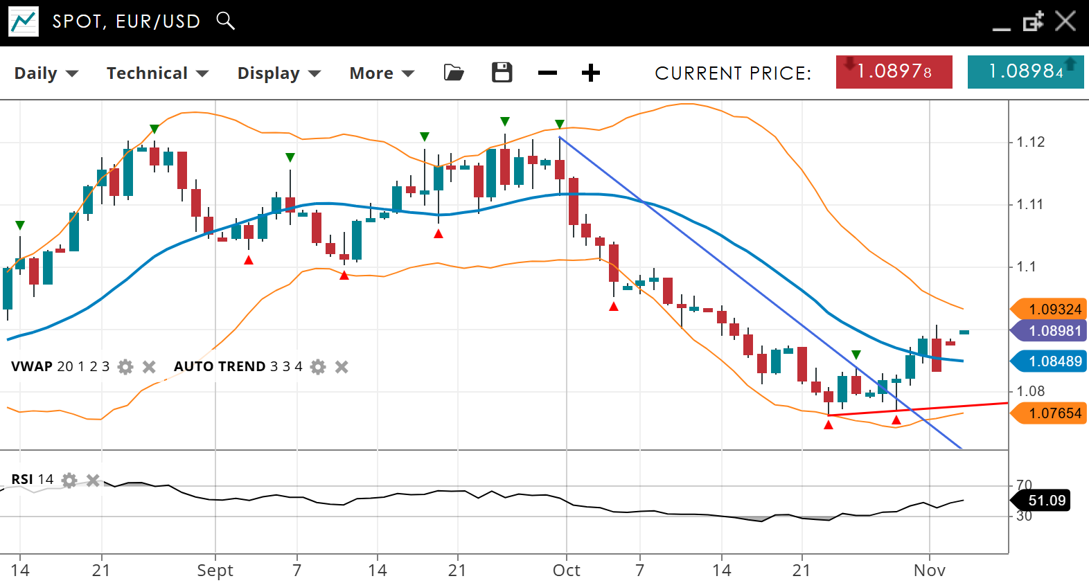 EUR/USD has moved to a corrective phase but remains in a bearish trend. The price is 1.0898, slightly above the VWAP (20) of 1.0848 after gapping back above a bearish engulfing candlestick. Support is at 1.0765, with resistance at 1.0932. The RSI is 51, suggesting a pause in downward momentum.
