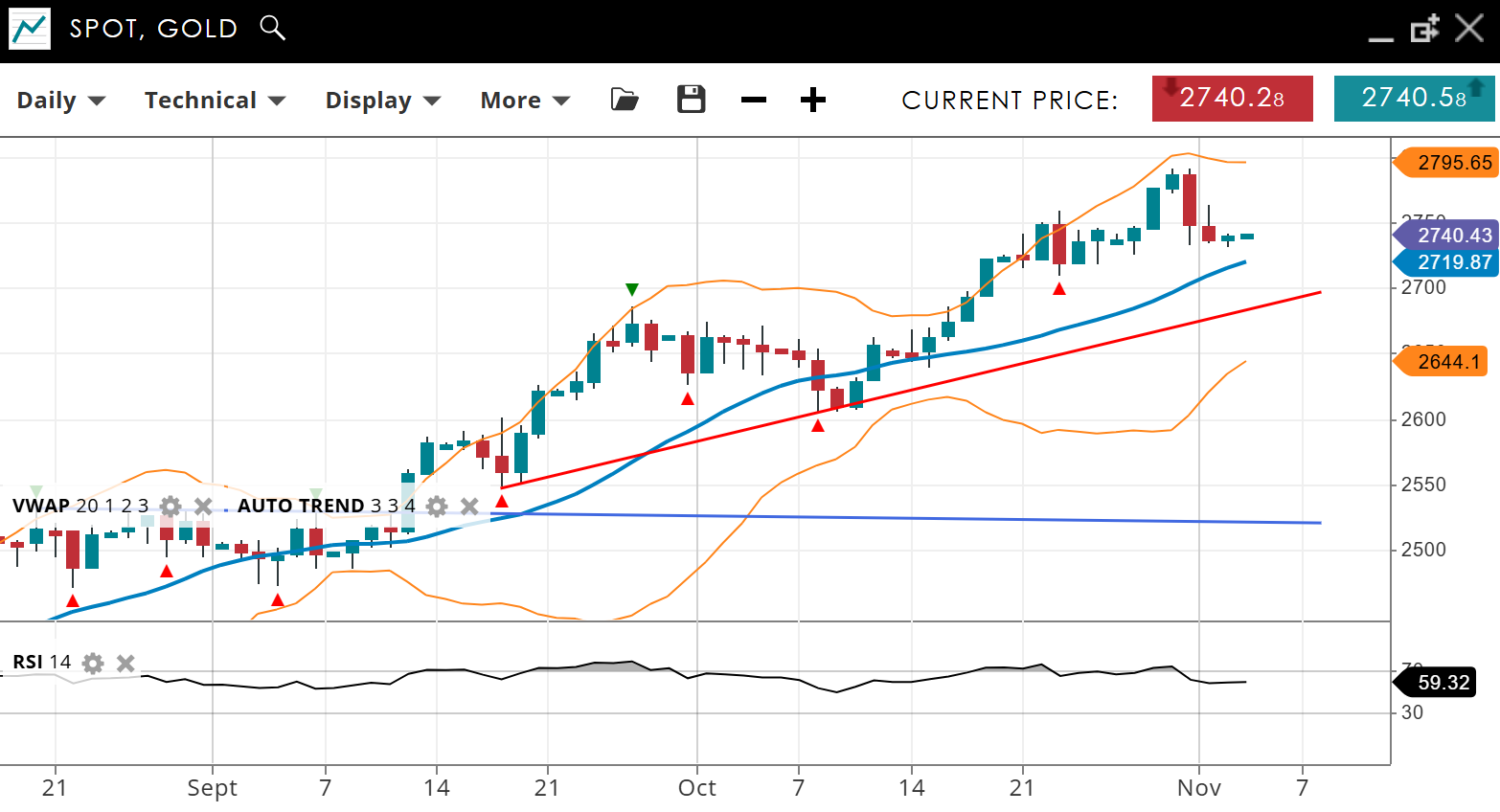 Gold remains bullish in an impulsive phase despite a small pullback. The bearish engulfing candlestick pattern is one to watch for a trend reversal. The current price is 2,740, above the VWAP (20) of 2,719. Support is found at 2,644, and resistance is at 2,795. The RSI is 59, reflecting strong bullish momentum without overbought conditions.