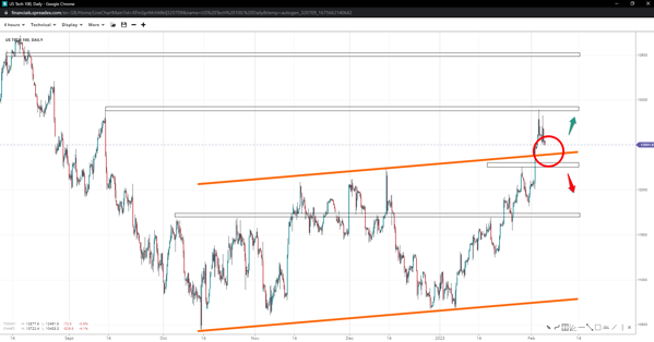 The US TECH index breached the upper channel trendline to recapture the 12880 resistance and is now correcting towards 12250. If the trendline offers a retest, bulls could revisit the peak and break past the 13k handle for a chance at 13500. Breaking through the trendline could see the 12k  lost and the door to 11700 wide open.