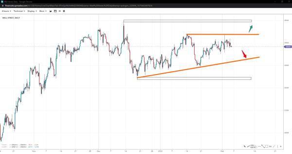 Wall Street trades in a narrow range resembling an ascending triangle pattern with a flag and a pennant still probable. 34350 appears as the peak, with its break sending the index to the 35k handle next. A pullback must occur before the breakout to validate the pattern towards the ascending trendline and near 33300. The invalidation is at the 33k handle, and if lost, 32500 is the next support.