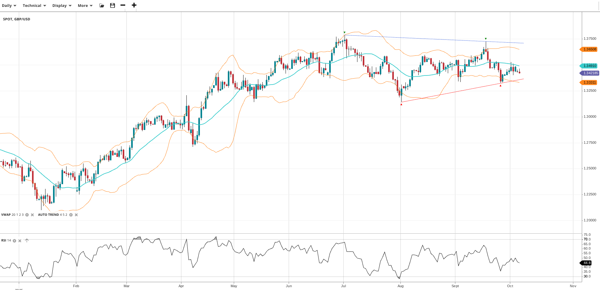 GBP/USD stays in a neutral trend and range phase, with price at 1.3422 and VWAP at 1.3491. RSI at 44.8 shows mildly bearish sentiment. Support is at 1.3331 and resistance at 1.3651.