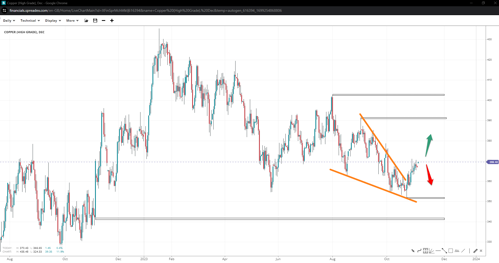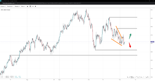 Despite looking bearish in the short term, Brent has not dropped the local support of $83 a barrel and has put a higher low in at $84.50/bbl, pending a bounce or a breakdown. In the former case, breaking past the wedge peaks of $87.70 and $89.50 could pave the way to $92.70/bbl unless we get a triangle, whereas in the latter case, major support lies at $81.50.