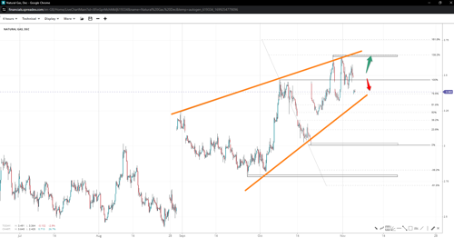 The commodity appears to have ended a wedge pattern at $3.65 unless there remains one more leg up past the peak and near $3.75. Losing the lower trendline could see prices fall to $3, followed by $2.80.