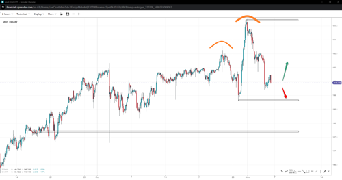 A head-and-shoulders pattern may be brewing in Germany’s 40 index following a bounce at the double-bottom support at 14580. Failing to get through 15580 will increase the chances of panning out, whereas a move past will likely invalidate it and head towards the next resistance at 16K. A successful rejection would imply further drops towards 14K.