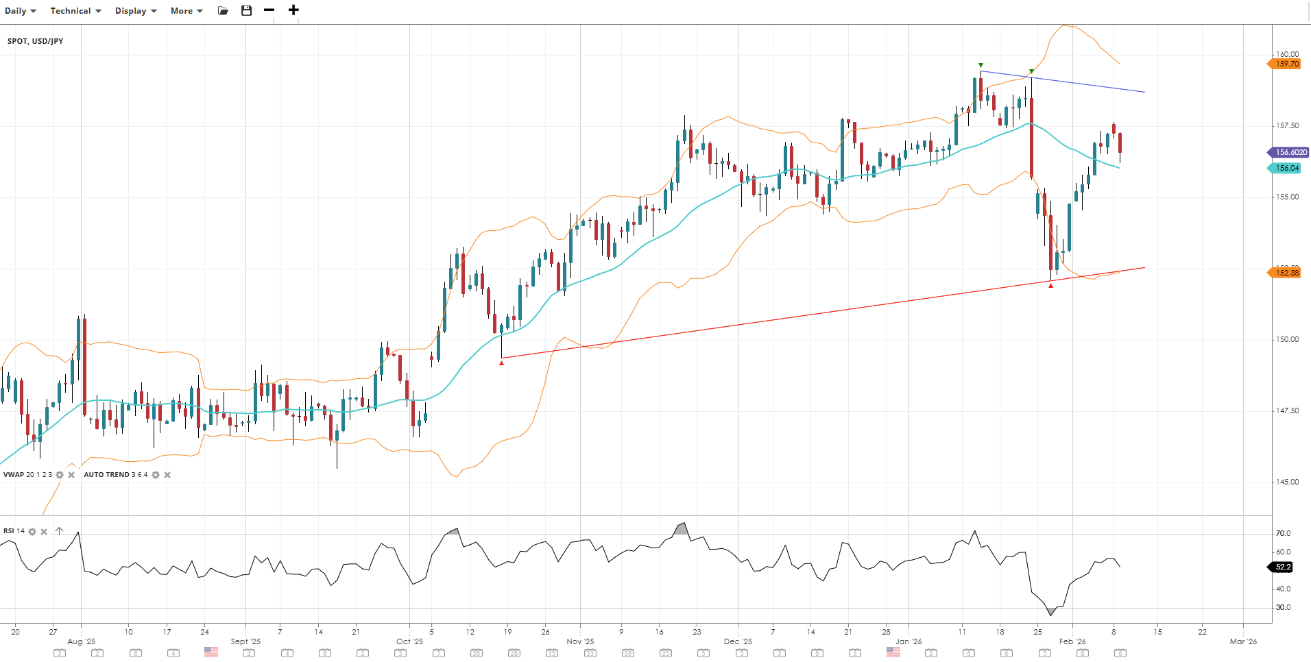 USD/JPY has recovered back to the 156 level after its recent decline, back above the VWAP but the trend is unclear. With RSI around 50, momentum is neutral, selling pressure could resume near the prior highs above 157.50.