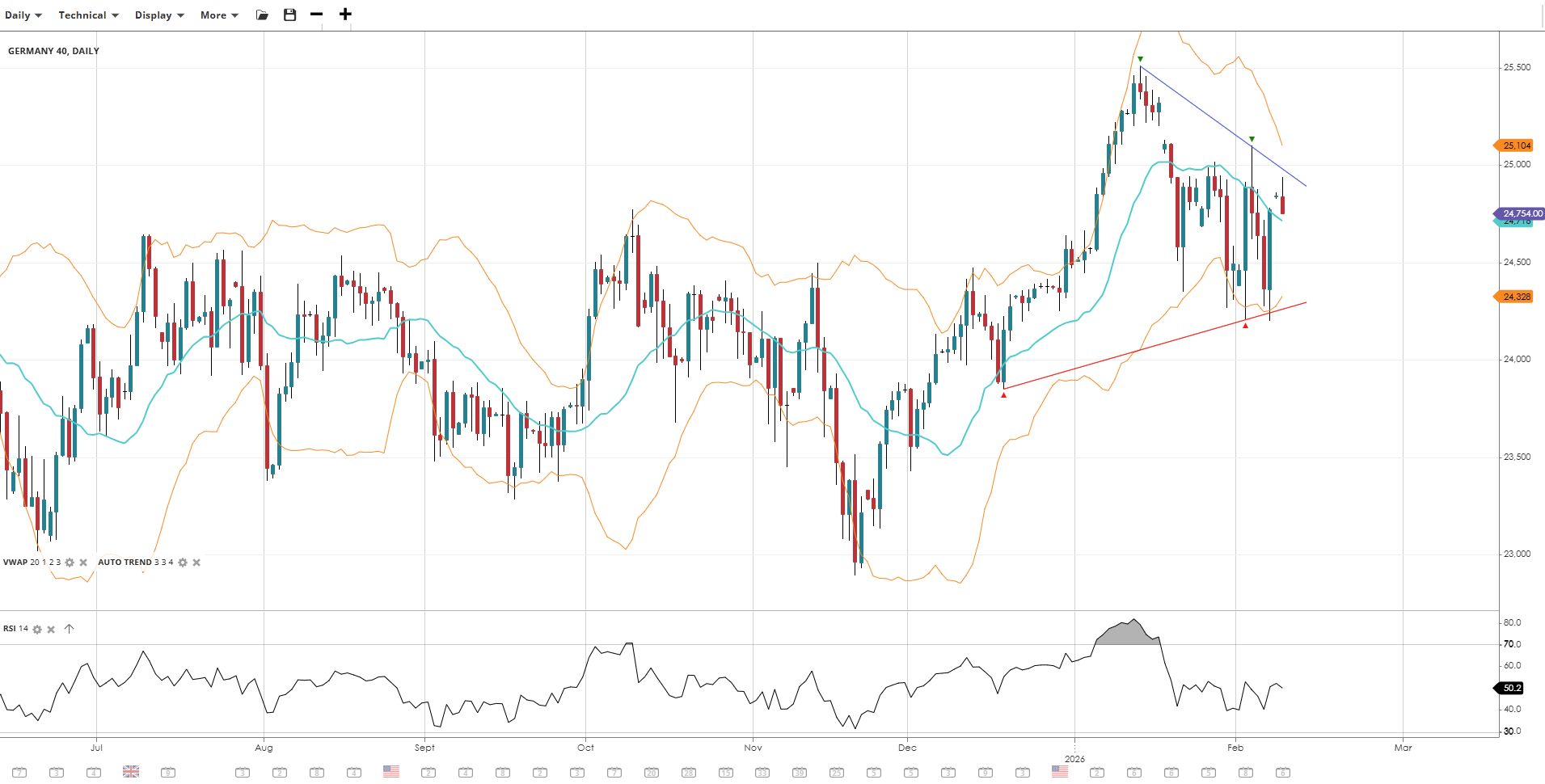 Germany 40 has been stable since its recent correction and has crossed back above the VWAP, with price now testing the 25k level. Momentum has improved with RSI returning to the neutral 50 level, indicating the correction may be stabilising as the bullish trend attempts to reassert itself.