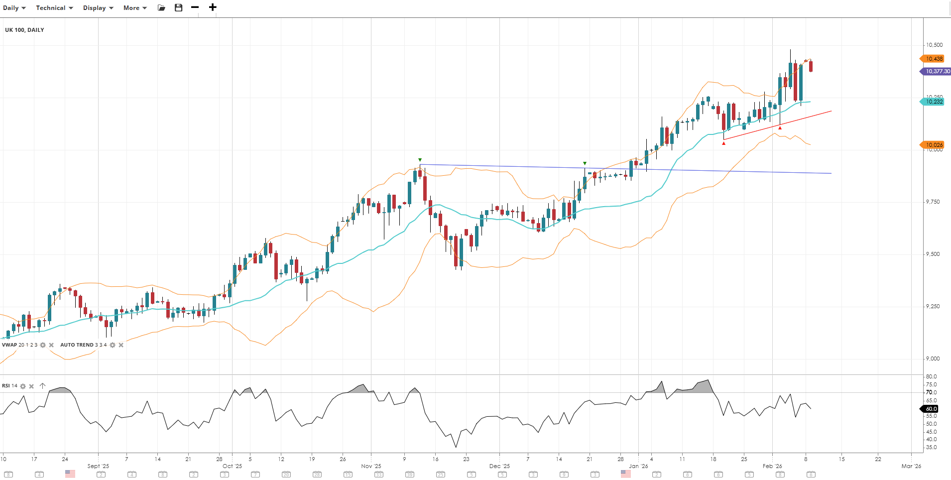 UK 100 has broken to new highs above 10,400, trading above the VWAP with strong bullish momentum. RSI has risen above 60, signaling increasing buying pressure as the index extends its bullish trend. Support holds comfortably above the 10k level.