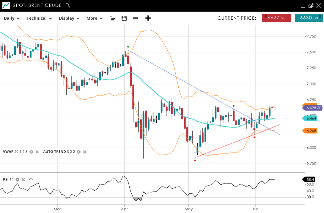 Brent Crude is in a neutral consolidation phase, trading at 6,628, slightly above its VWAP of 6,464, indicating tight price action. The RSI at 58.4 suggests a balanced market outlook. Support is at 6,268, with resistance at 6,640.