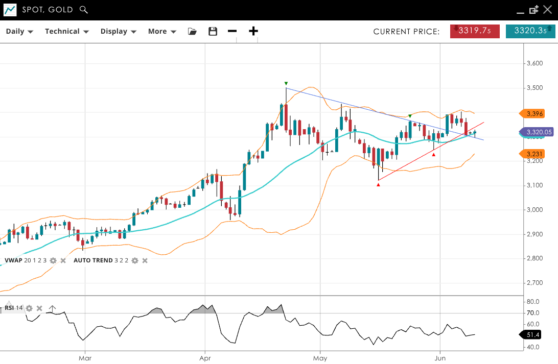 Gold remains in a neutral consolidation phase, trading at 3,320, marginally above its VWAP of 3,310, indicating cautious market interest. The RSI at 51.4 points to a neutral stance. Support is at 3,231, with resistance at 3,396.