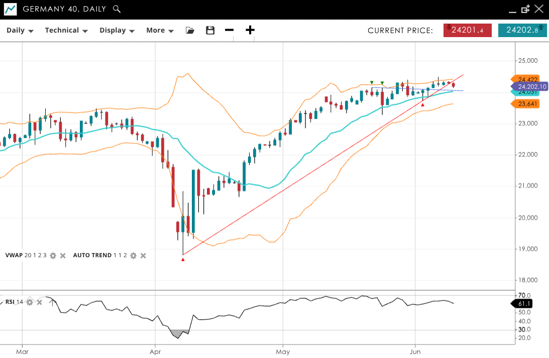 Germany 40 remains in a bullish trend and is currently in an impulsive phase, trading at 24,202, slightly above its VWAP of 24,031. The RSI at 61.1 suggests steady buying interest. Support is at 23,641, with resistance at 24,422.