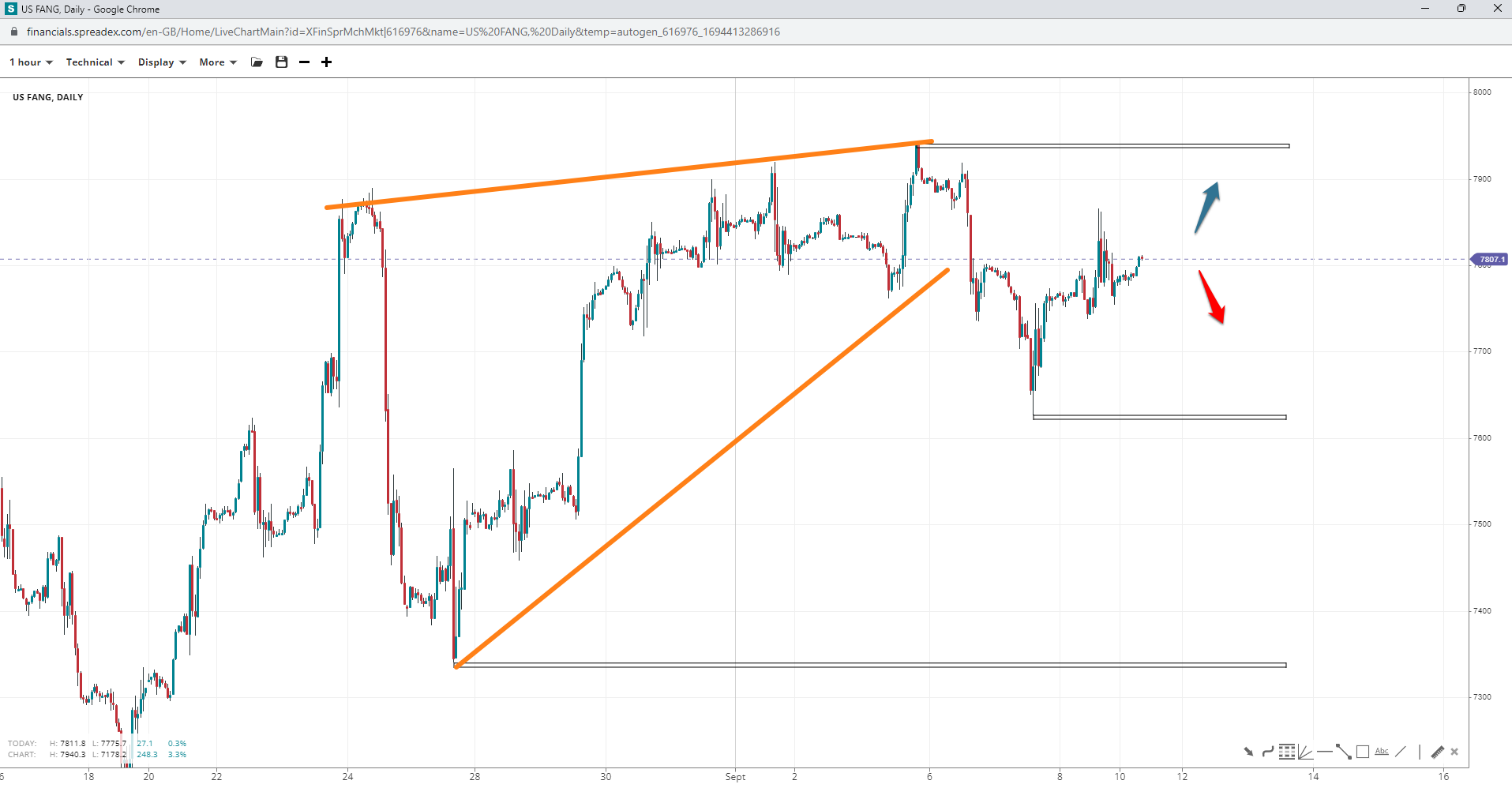 The FANG index has probably formed a wedge pattern to 7940, pending pullbacks towards 7625 unless momentum strengthens to expose 7340. If bulls reclaim the short-term resistance at 7865, the break of the could send prices towards the 8k handle.