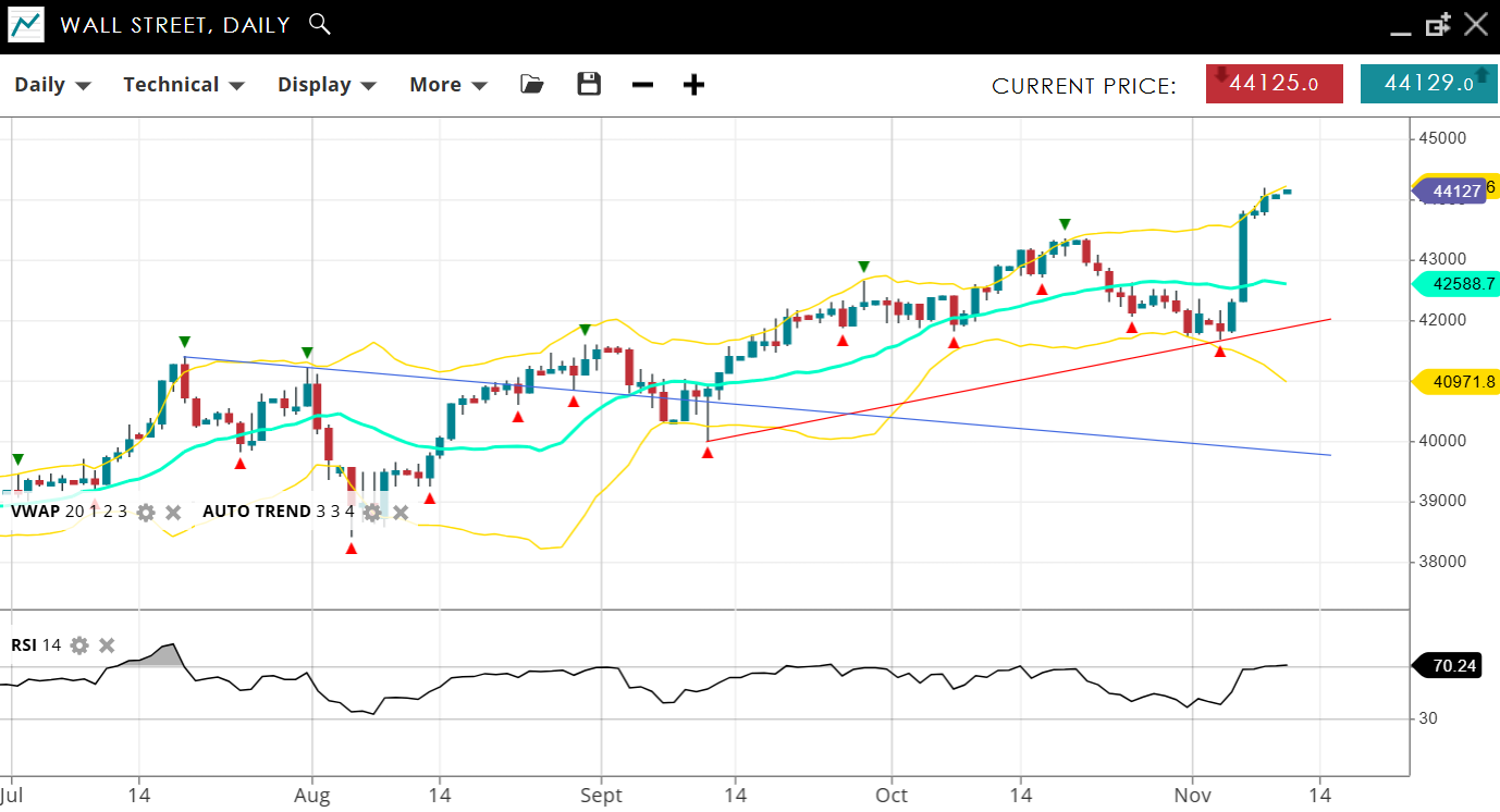 Wall Street is in a bullish, impulsive phase, reaching 44,127- a record high and well above the VWAP (20) of 42,588. Support is at 40,971, while resistance is nearby at 44,120. The RSI at 70 shows strong momentum, nearing overbought conditions, signalling caution for further gains in the short term.