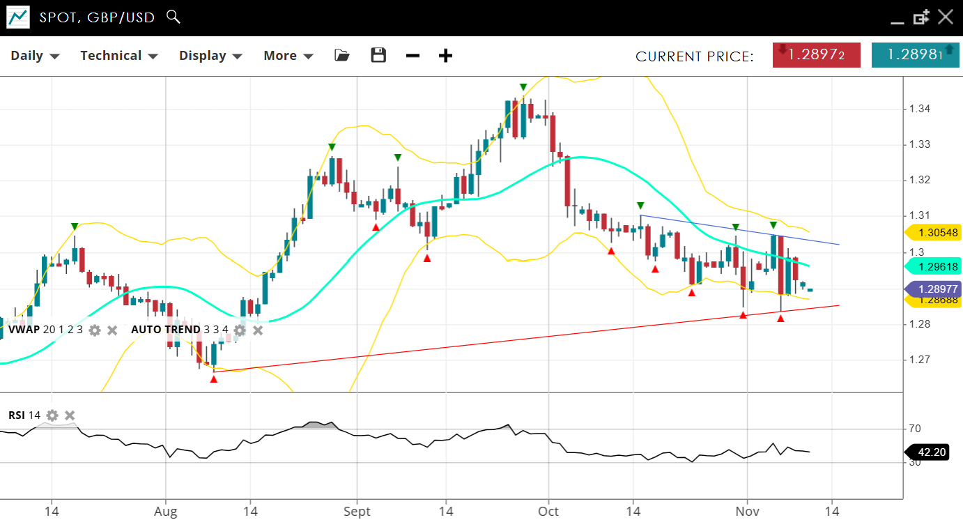 GBP/USD is neutral in a consolidation phase with a bearish bias at 1.2897, just under the VWAP (20) of 1.2961. Support sits at 1.2868, and resistance at 1.3054. With an RSI of 42, the pair shows mild bearish momentum within its consolidation phase.