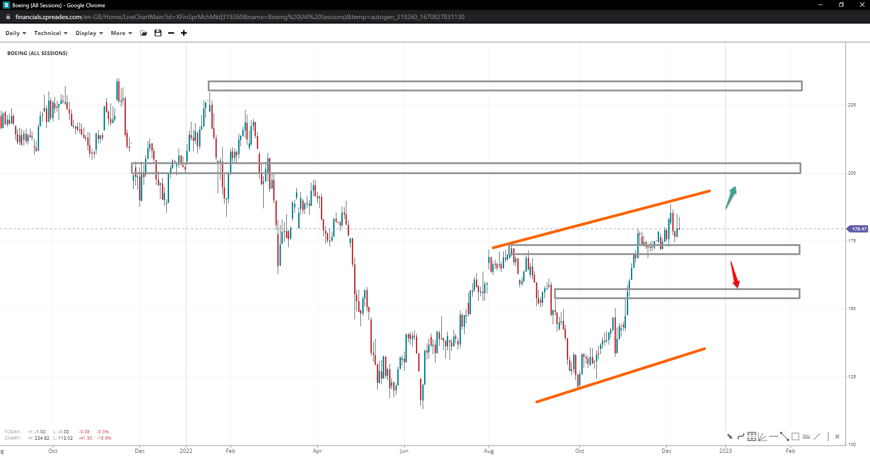 Boeing appears in an ascending channel or rising wedge after putting in a low at 112. With prices above the 172 swing, the stock might accelerate towards the 200 handle where a rejection might be seen. Breaking above brings the 230 in focus. Losing the swing support might see the price decline to 150 if the 162 support gives in to pressure
