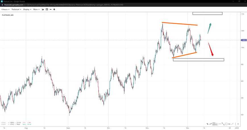 The prices of platinum completed a rising pennant with 1075 back in the spotlight. A reversal might follow a rejection to 970 if the 1k succumbs to pressure, whereas a breach might see prices sent to the 1100 handle and beyond.